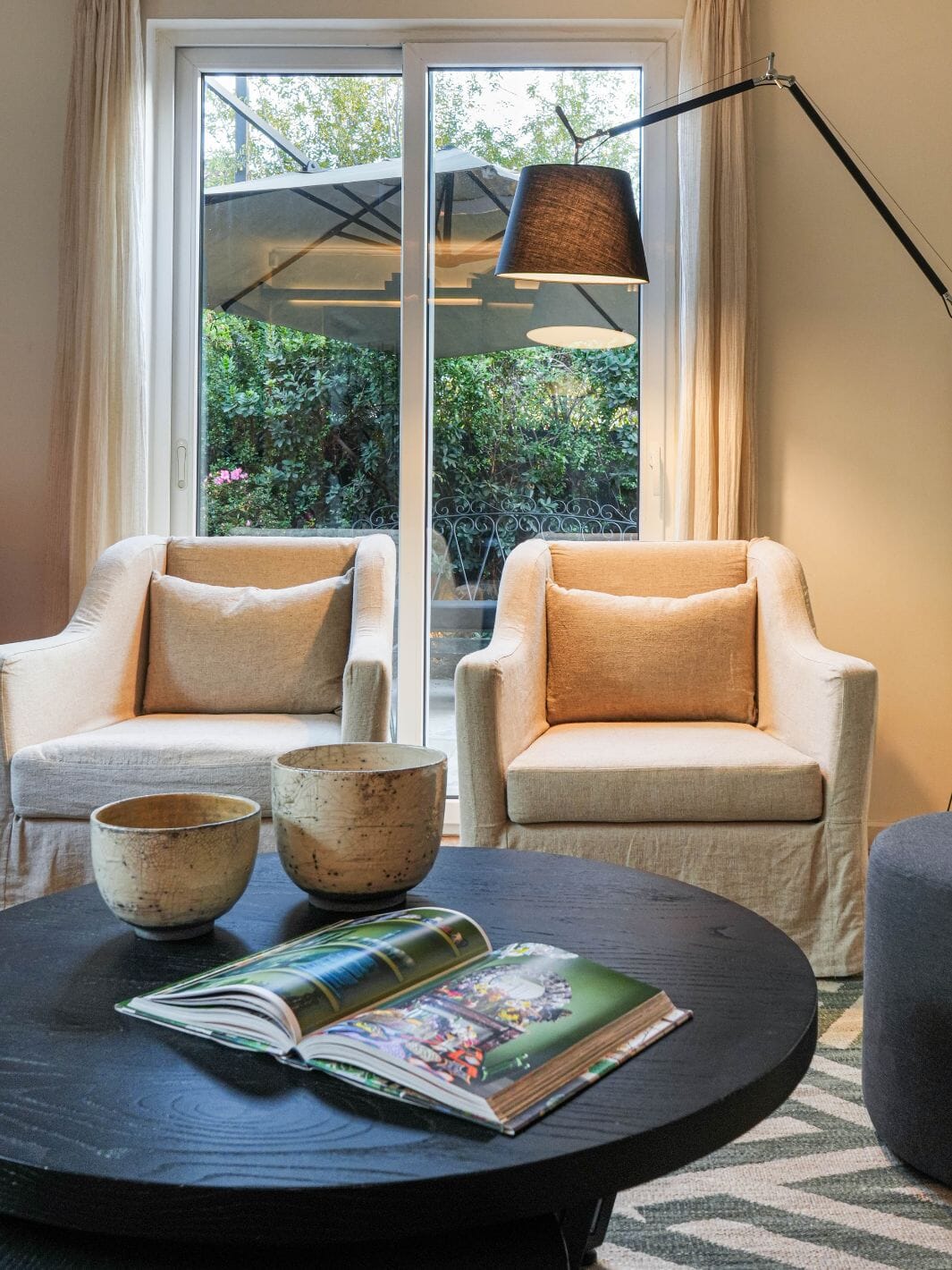 Nuestro sitial Biarritz con funda de lino color tostado. Una pieza que muestra sofisticación y comodidad en un diseño moderno.