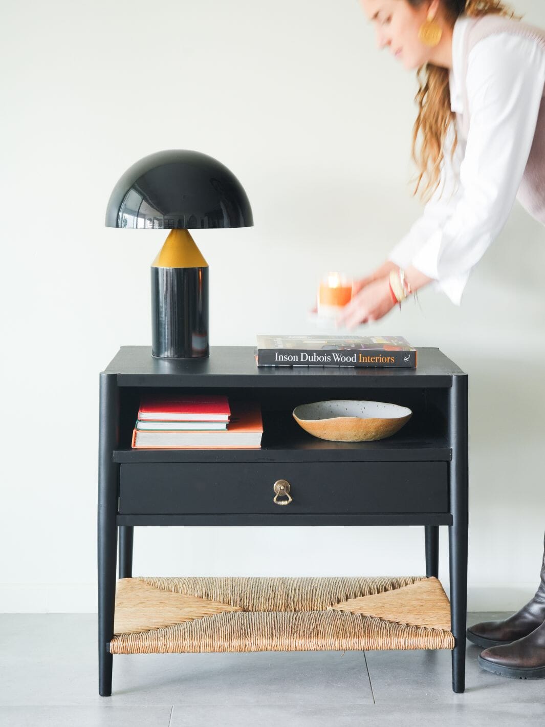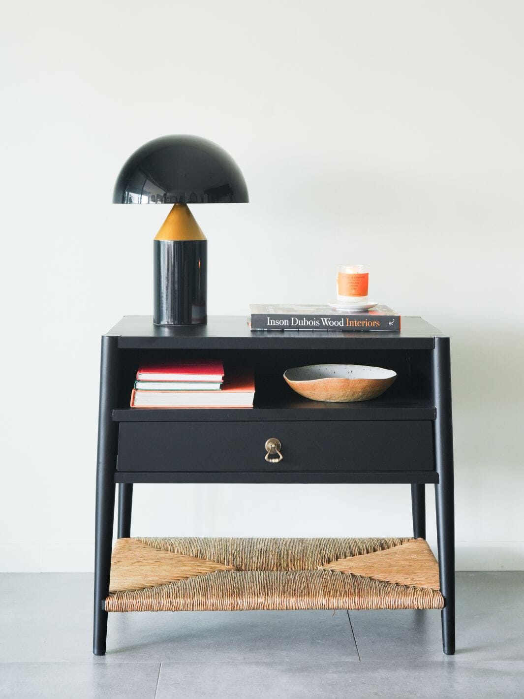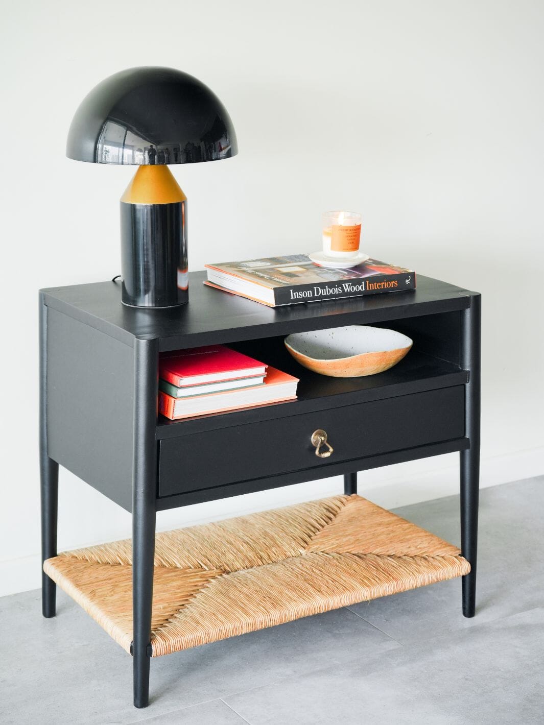 Nuestro velador Oporto combina diseño elegante y funcionalidad, ideal para dar calidez y estilo a tu dormitorio. Su estructura en madera de castaño pintada en negro mate aporta modernidad, mientras que la repisa inferior de fibra natural tejida añade textura y un toque orgánico único. Es perfecto para acompañar lámparas, libros y objetos decorativos, este velador es un detalle de diseño que transforma espacios.