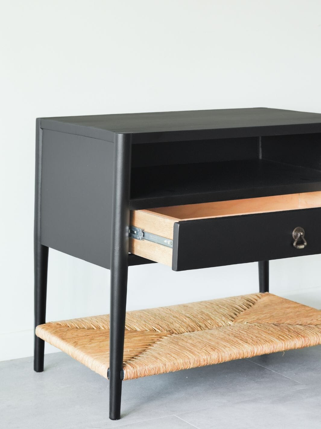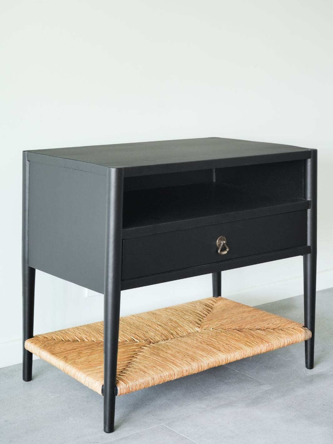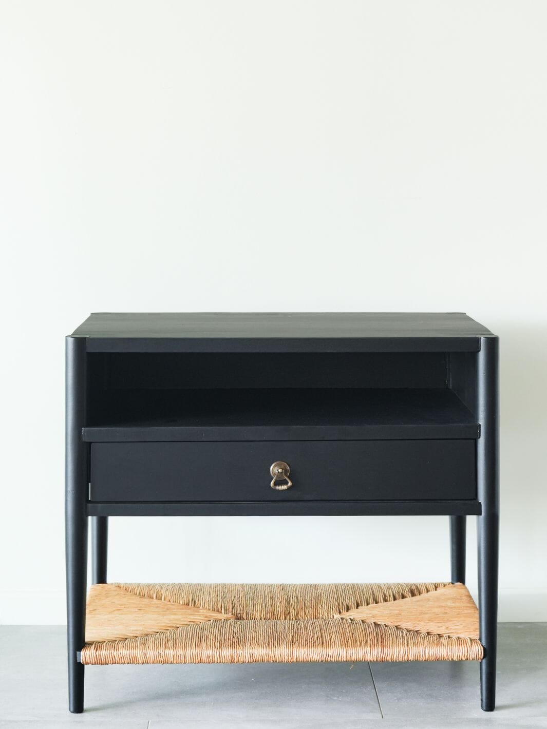 Nuestro velador Oporto combina diseño elegante y funcionalidad, ideal para dar calidez y estilo a tu dormitorio. Su estructura en madera de castaño pintada en negro mate aporta modernidad, mientras que la repisa inferior de fibra natural tejida añade textura y un toque orgánico único. Es perfecto para acompañar lámparas, libros y objetos decorativos, este velador es un detalle de diseño que transforma espacios.