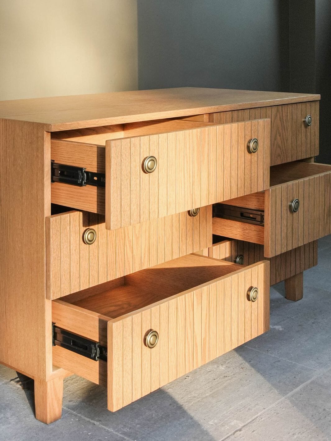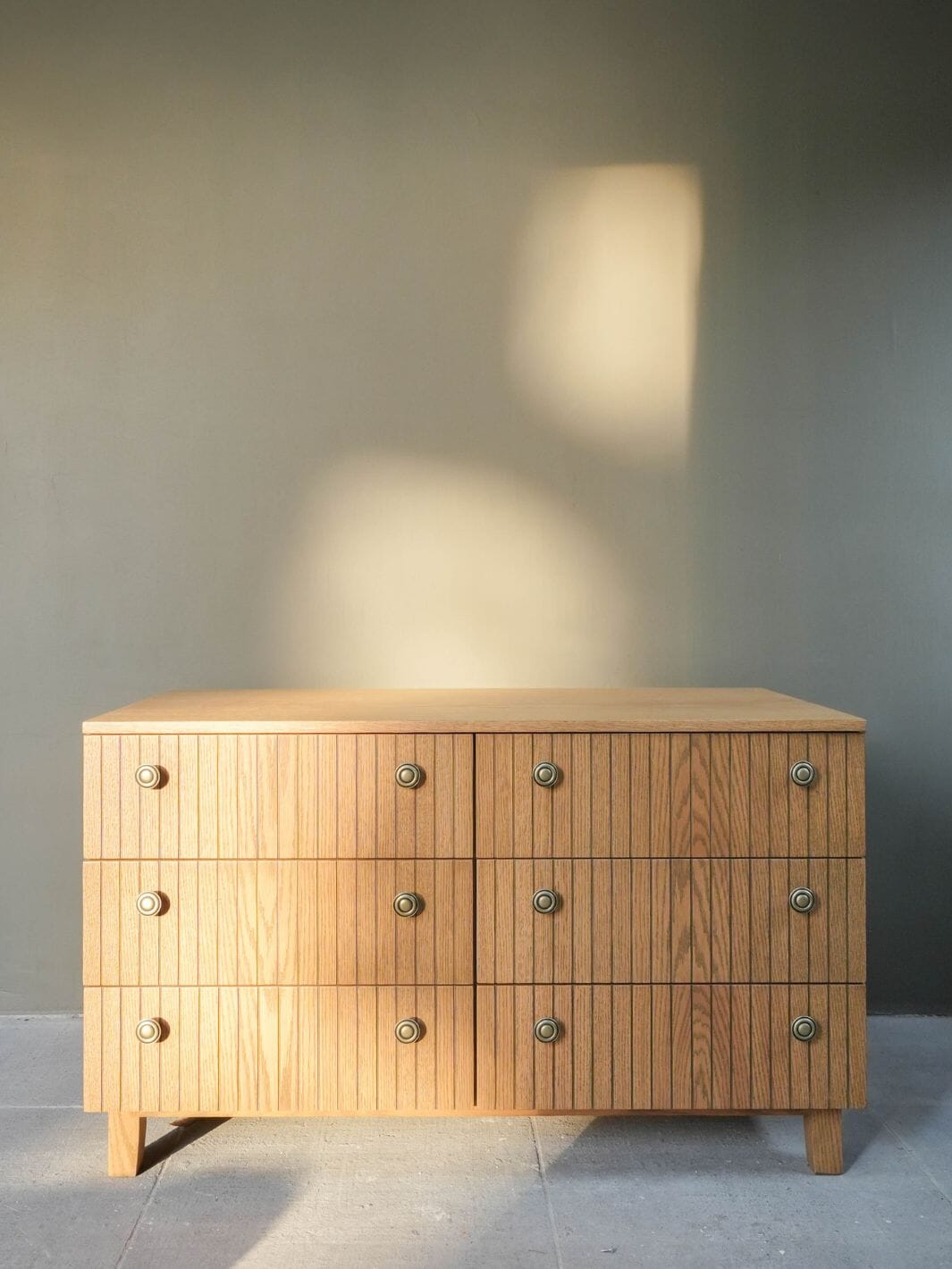 Estructurado con madera natural de encina en un acabado color tostado. Contiene 6 amplios cajones de almacenamiento que se deslizan silenciosamente con tiradores color dorado envejecido. Los cajones cuentan con un detalle de ranuras muy original hecho a mano. Equipados con correderas de cierre telescópico, que permiten un deslizamiento fluido y sin esfuerzo.