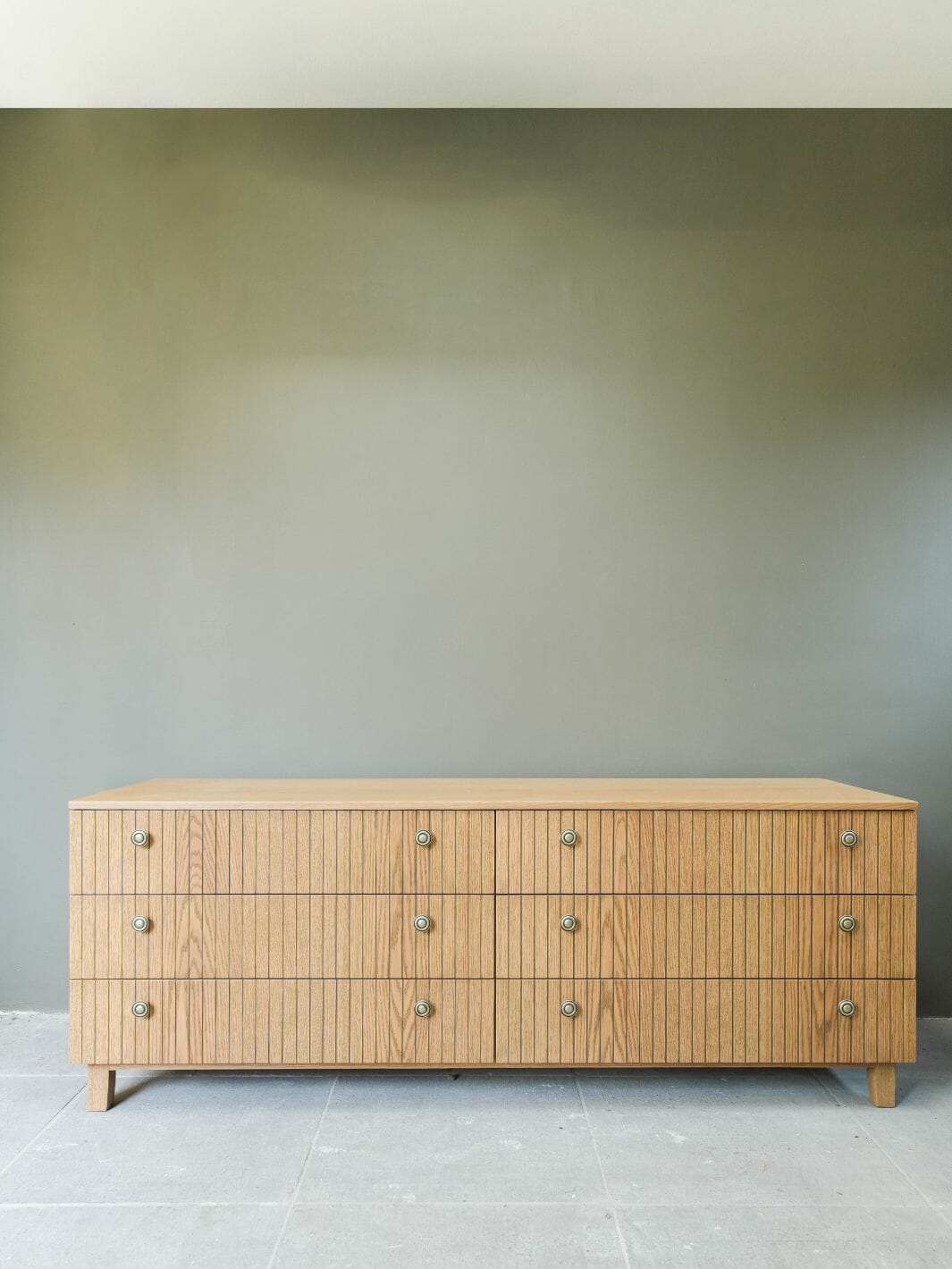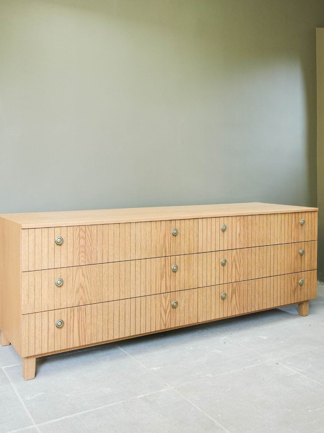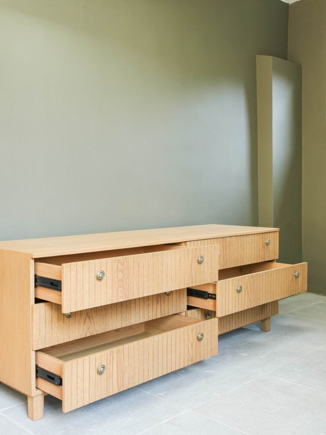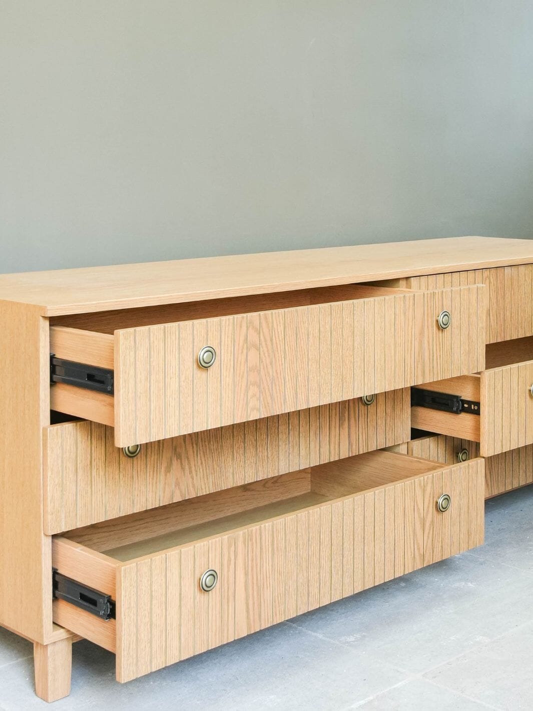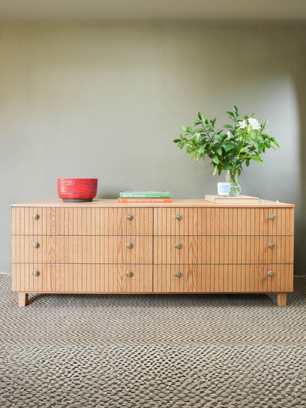 Estructurado con madera natural de encina en un acabado color tostado. Contiene 6 amplios cajones de almacenamiento que se deslizan silenciosamente con tiradores color dorado envejecido. Los cajones cuentan con un detalle de ranuras muy original hecho a mano. Equipados con correderas de cierre telescópico, que permiten un deslizamiento fluido y sin esfuerzo.